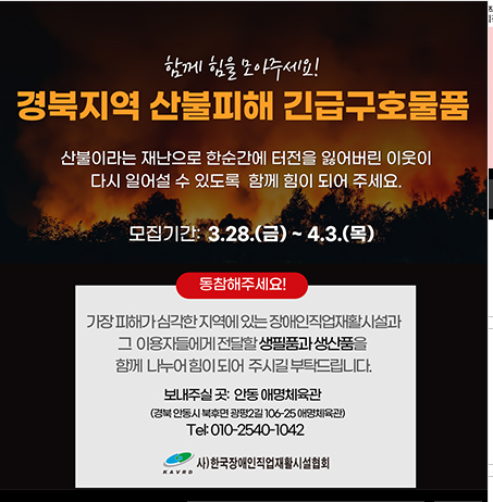 산불피해 긴급 구호물품 함께 힘을 모아주세요 동참해주세요 - 페이지 정보 작성자 관리자 댓글 0건 조회 236회 작성일 25-03-29 13:33 본문 중앙협회 끌어옴 목록 이전글강원특별자치도 장애인생산품판매시설과 함꼐하는 지원사업 25.03.29 다음글2025년 4월 1일 --공공기관 중증장애인 생산품 우선구매교육 25.03.10 댓글목록 댓글목록 등록된 댓글이 없습니다.